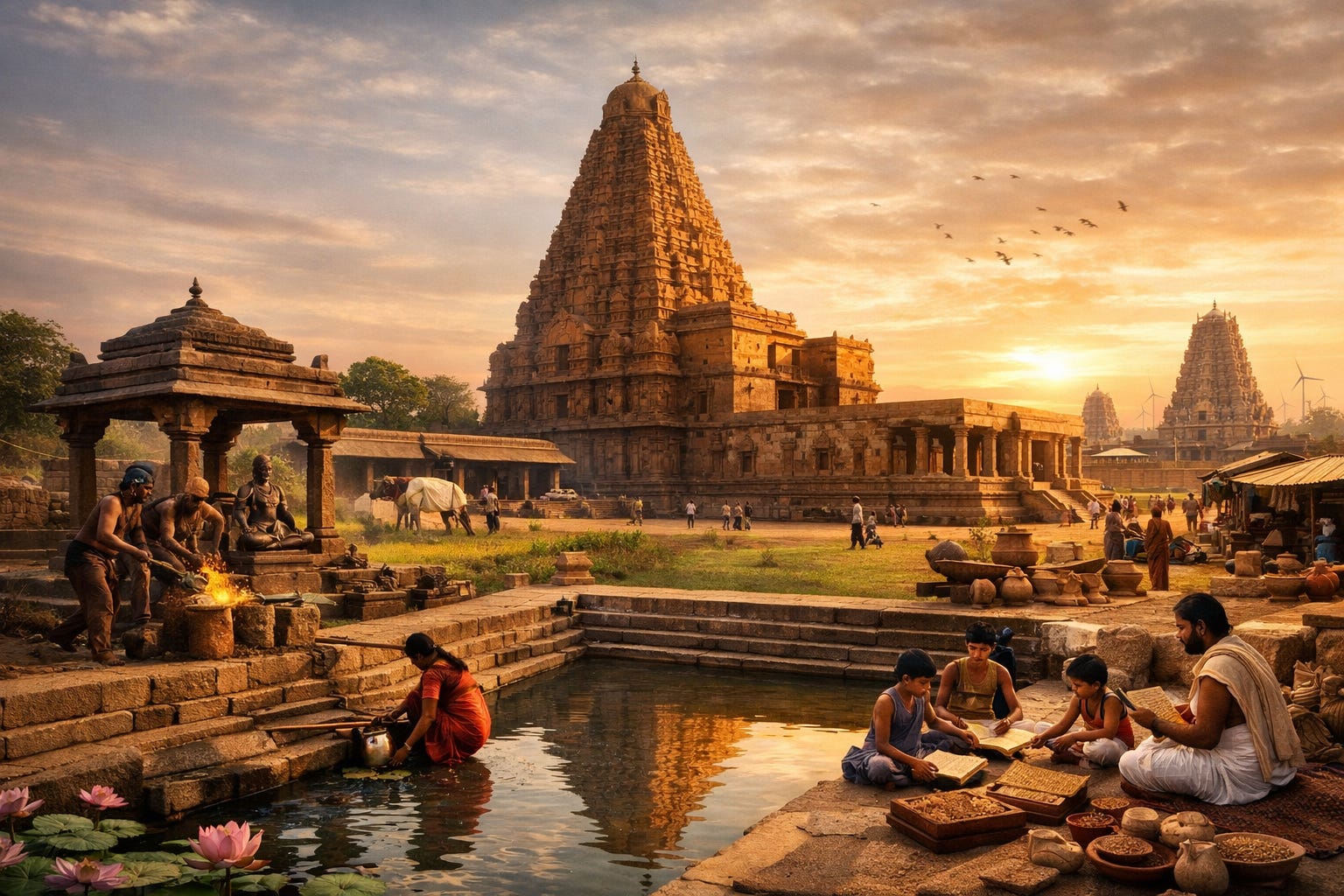 Mathematics, astronomy, grammar, music, philosophy, medicine, and commentary traditions were nourished through temple-linked networks. Knowledge was not divorced from society. It was embedded in festivals, calendars, social participation, and patronage systems - allowing learning to thrive within community life. [8][9]