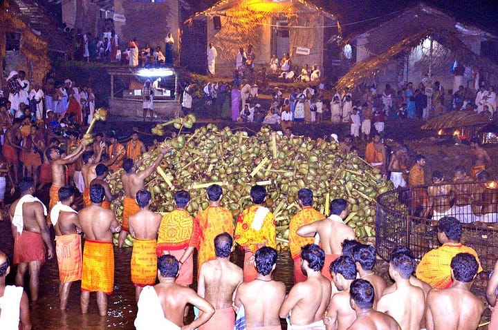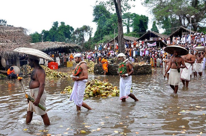 Devotees cross the Bavali, barefoot and humble, carrying offerings of ghee, coconuts, and flowers - symbolic of surrender to the primal source.