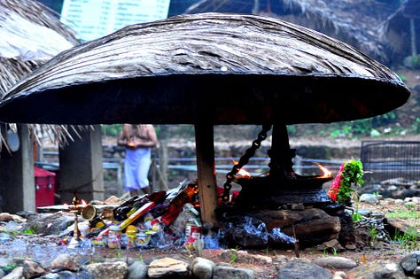 Throughout the year, the Ikkare Kottiyoor stands as the guardian of continuity, a place of daily worship and devotion. But for those 27 sacred days when Akkare Kottiyoor bursts into ritual life, the forest becomes a living temple. The thatched huts, the open sky, the rock of Ammarakalu Thara - they do more than host events. They are the event: a reenactment of the primal sacrifice whereby divine energy fractured, scattered, and became accessible to all.