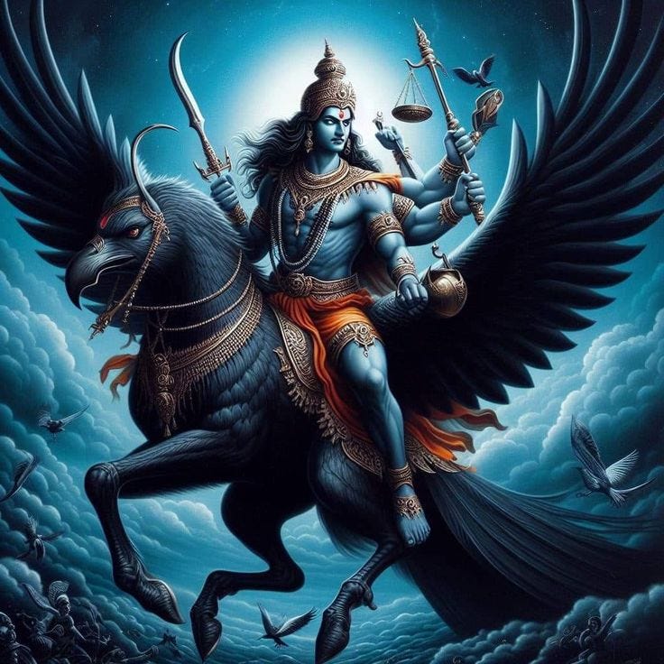 Often depicted as a dark figure seated on a crow or buffalo, his gaze is believed to carry the weight of cosmic justice. He is the son of Surya (the Sun God) and Chhaya (shadow), which symbolically expresses how even the brightest light casts a shadow that cannot be escaped -just as karma cannot be denied.