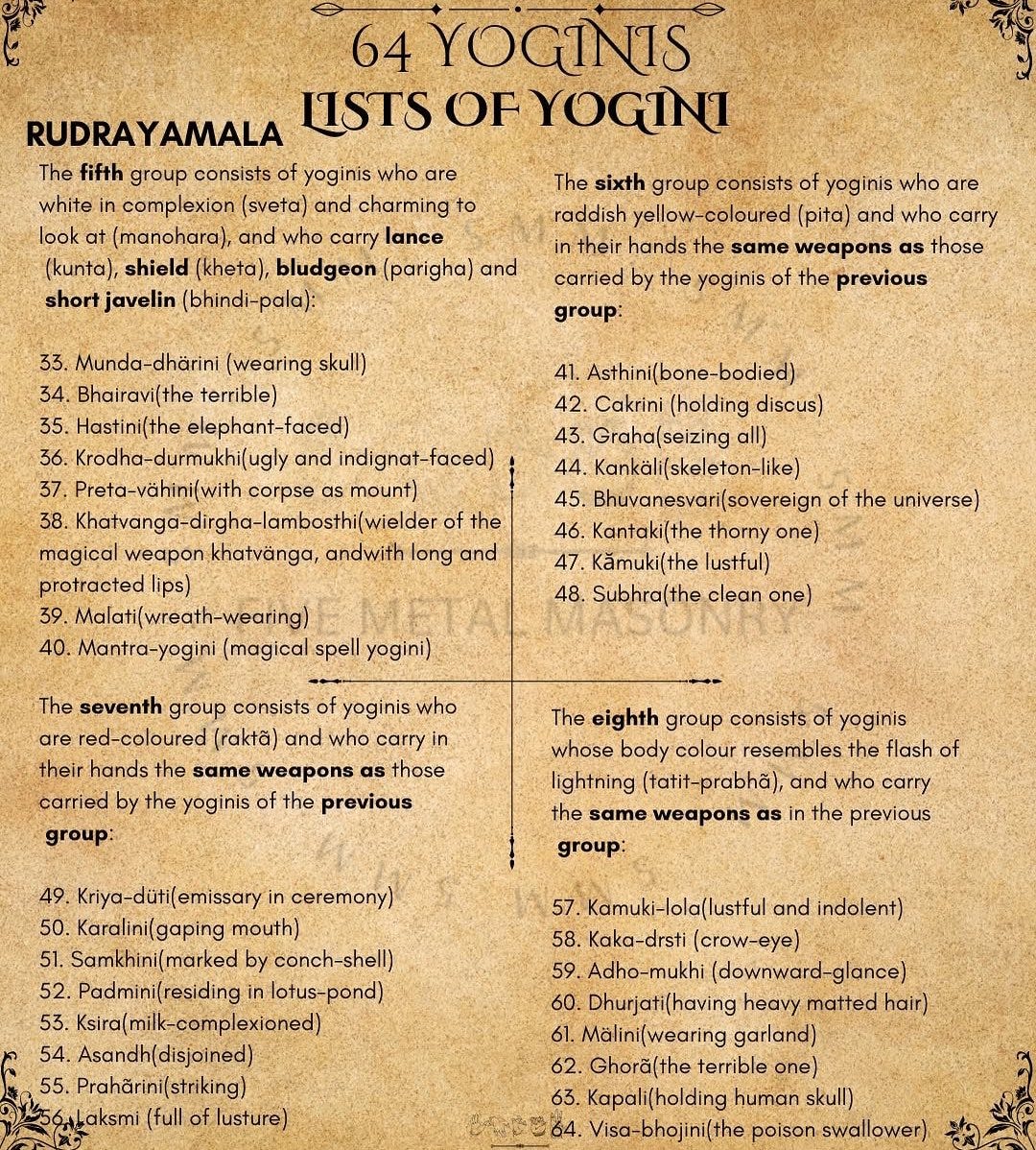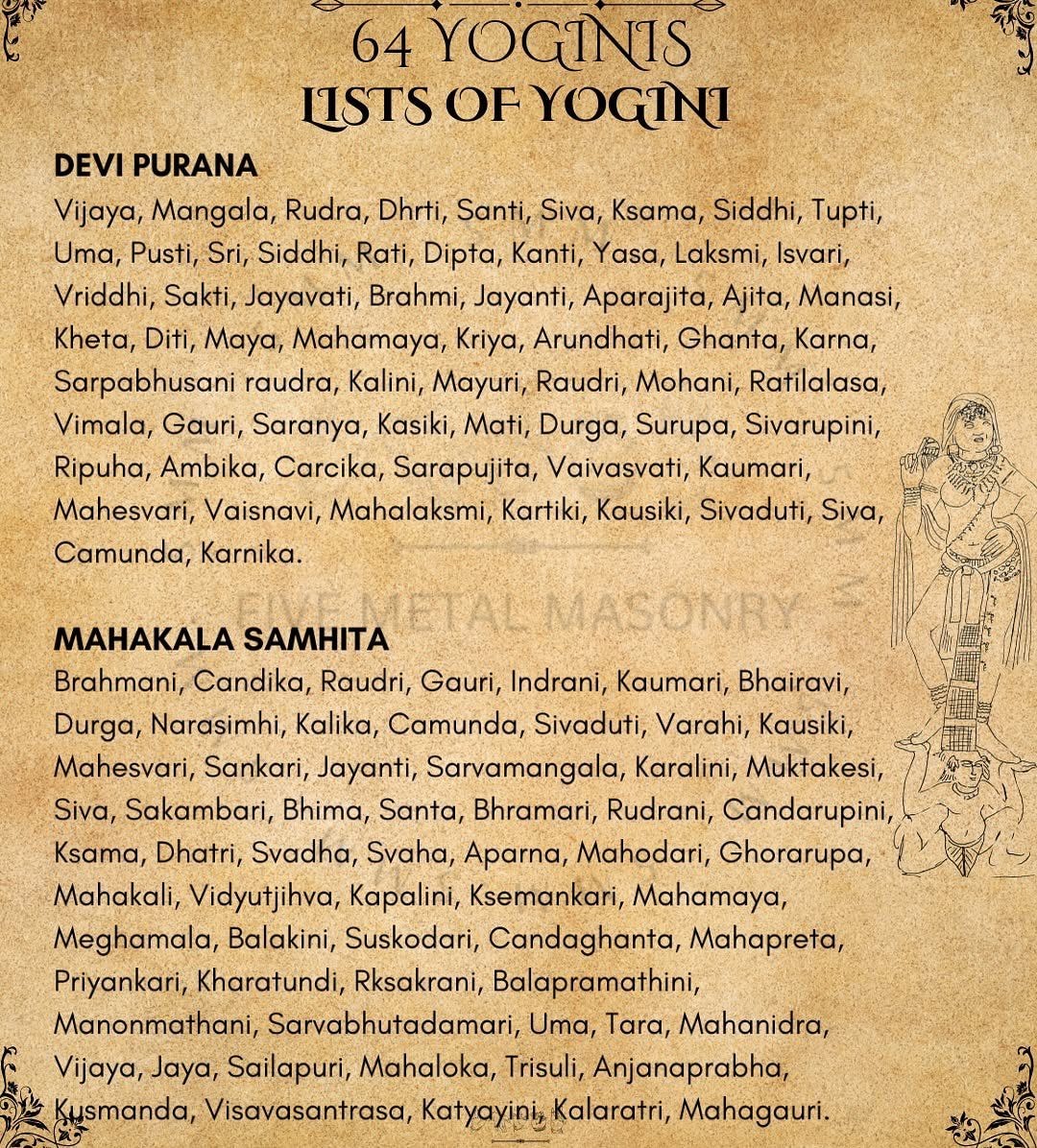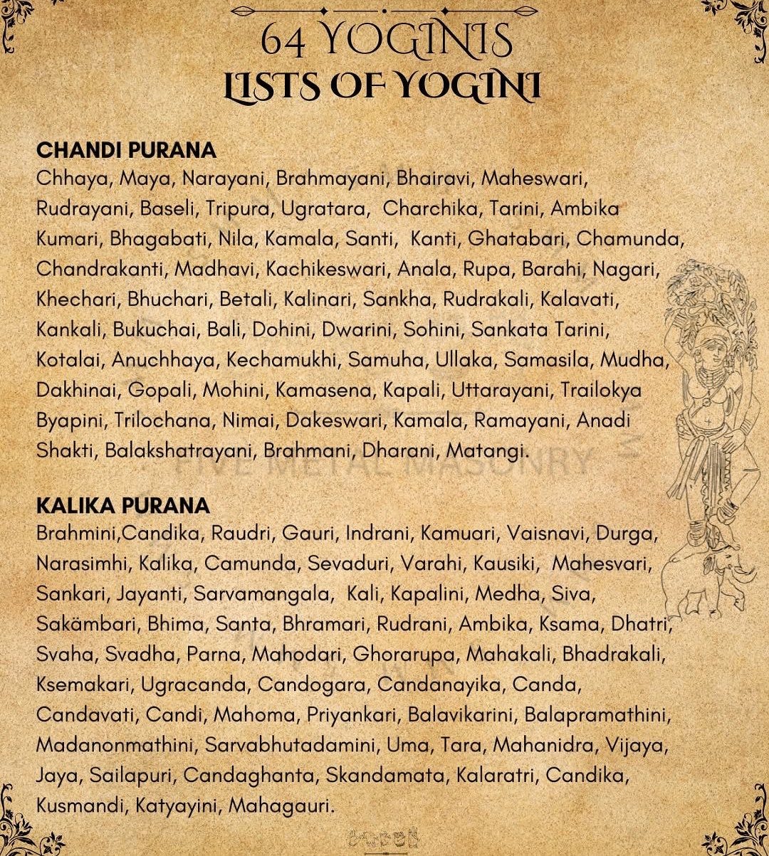 The Devi Purāṇa presents a more yogic and psychological perspective, listing Yoginīs with names that represent virtues and internal powers. These include Dṛti (fortitude), Yasa (fame), Kriyā (action), Māyā (illusion), Ratilālasā (lustfulness), Sāntī (peace), and Matangī (a form of Sarasvatī), showing an inward, devotional, and spiritual orientation.
