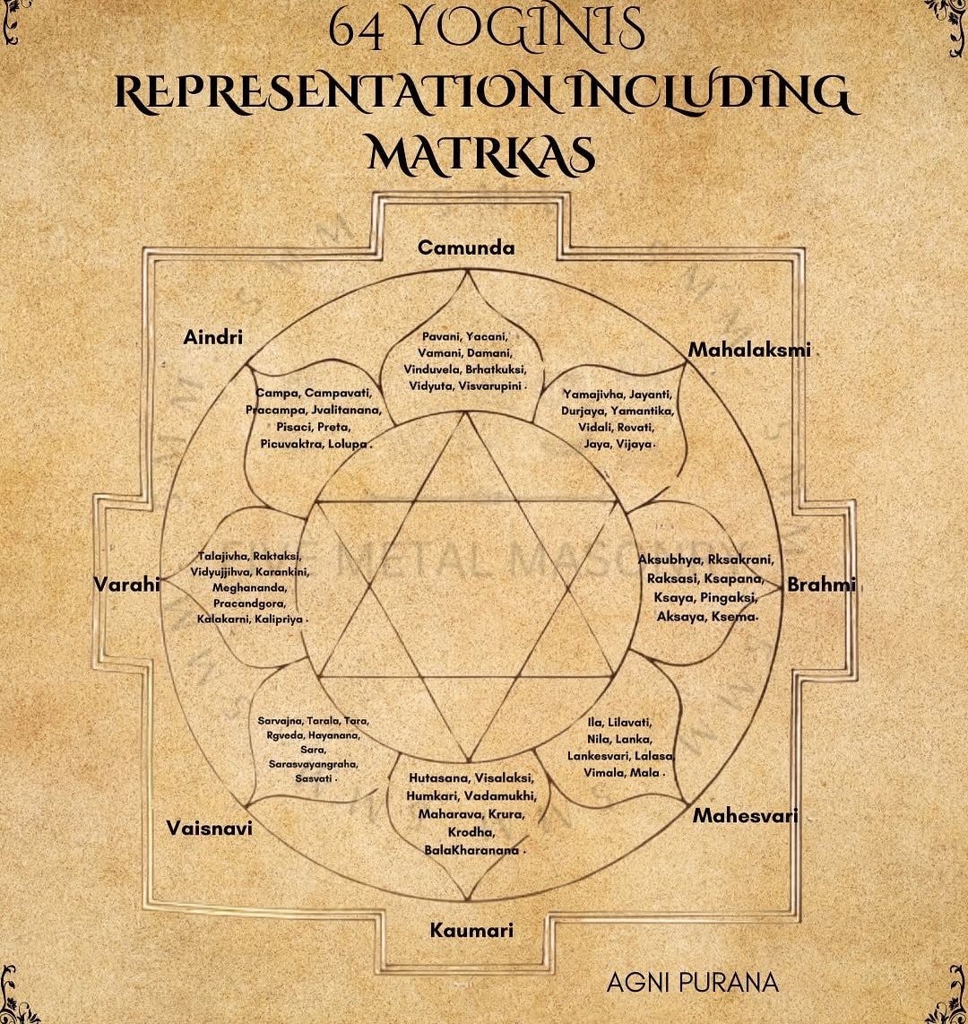A unique and symbolic representation of the 64 Yoginīs is found in the Agni Purana, where they are arranged around the Ashta Matrikās (Eight Divine Mothers). This reflects the mandala principle in Tantra—mapping spiritual energy in geometric formations.