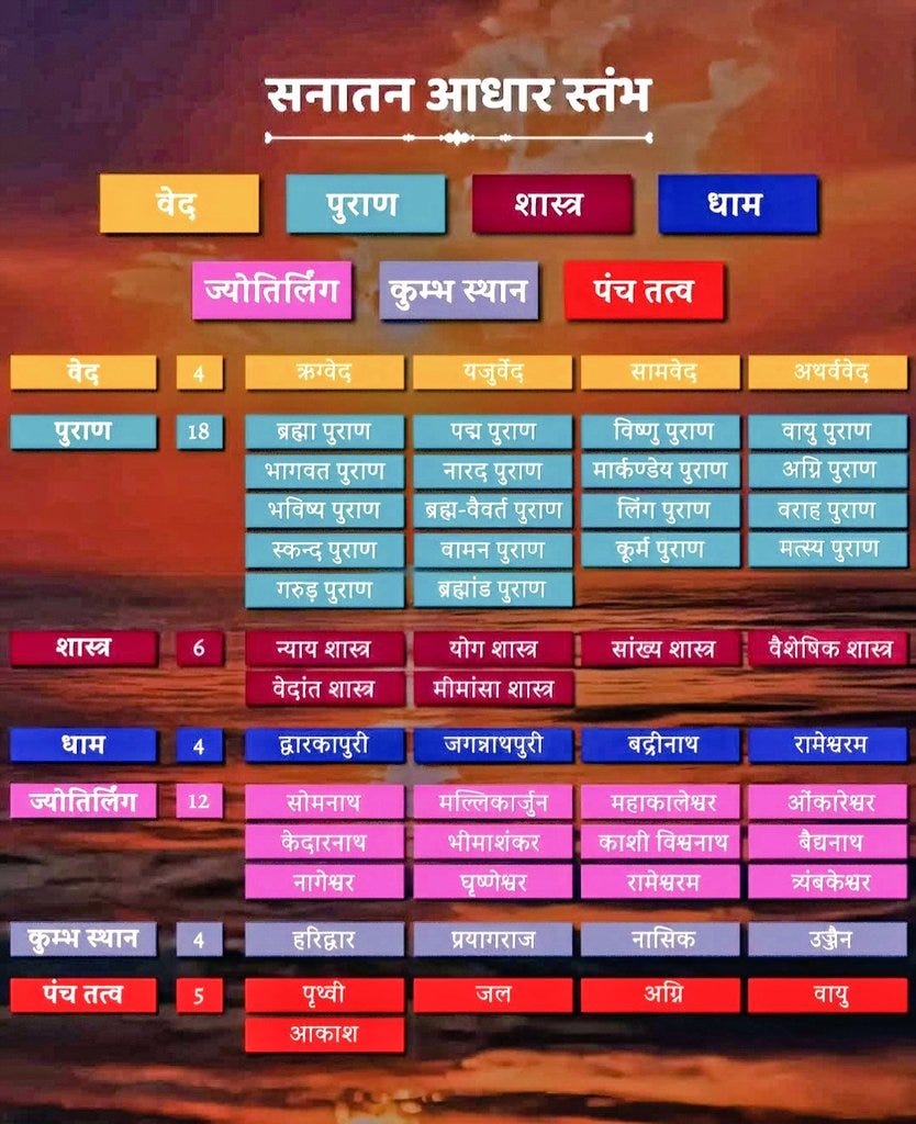 The rich and ancient knowledge of Sanatan Dharma stands on seven eternal pillars that span sacred scriptures, metaphysics, cosmology, pilgrimage, and philosophy. Here’s a detailed overview: